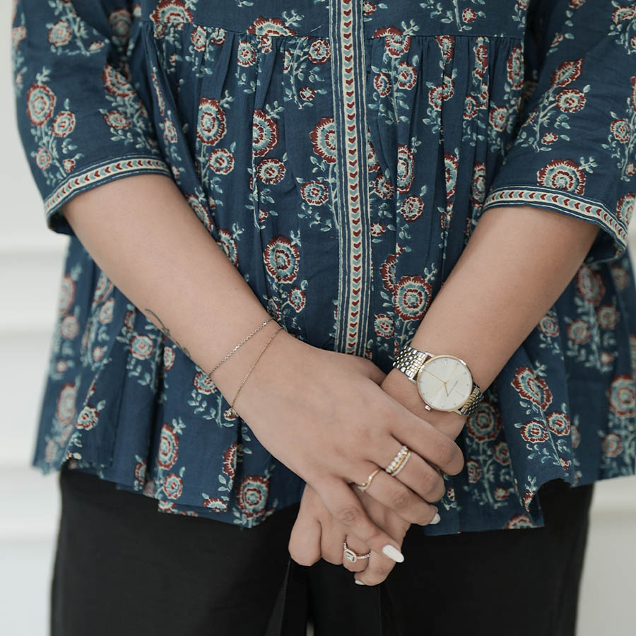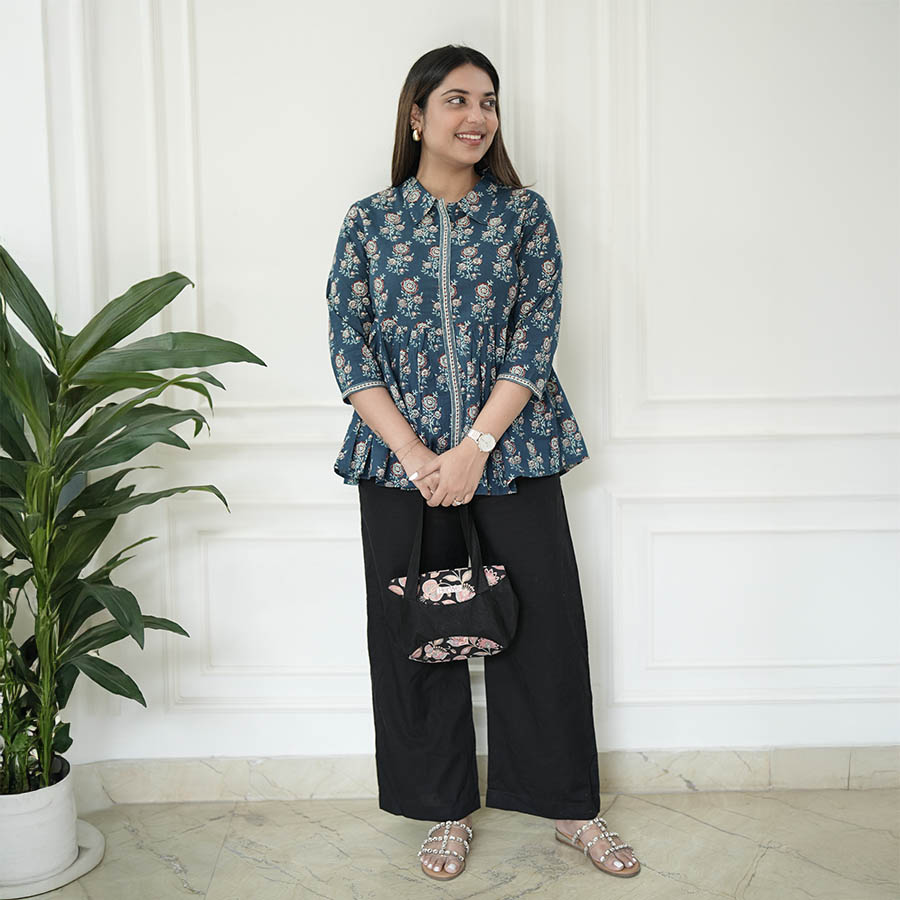 Fresh, feminine, and effortlessly flattering—the Blue Bloom Peplum Top is crafted in breathable cotton with a delicate floral print that feels like summer in motion. The peplum silhouette cinches softly at the waist and flares with playful ease, creating a look that’s equal parts graceful and chic. Easy to style and impossible to overlook, it’s your everyday statement made simple.