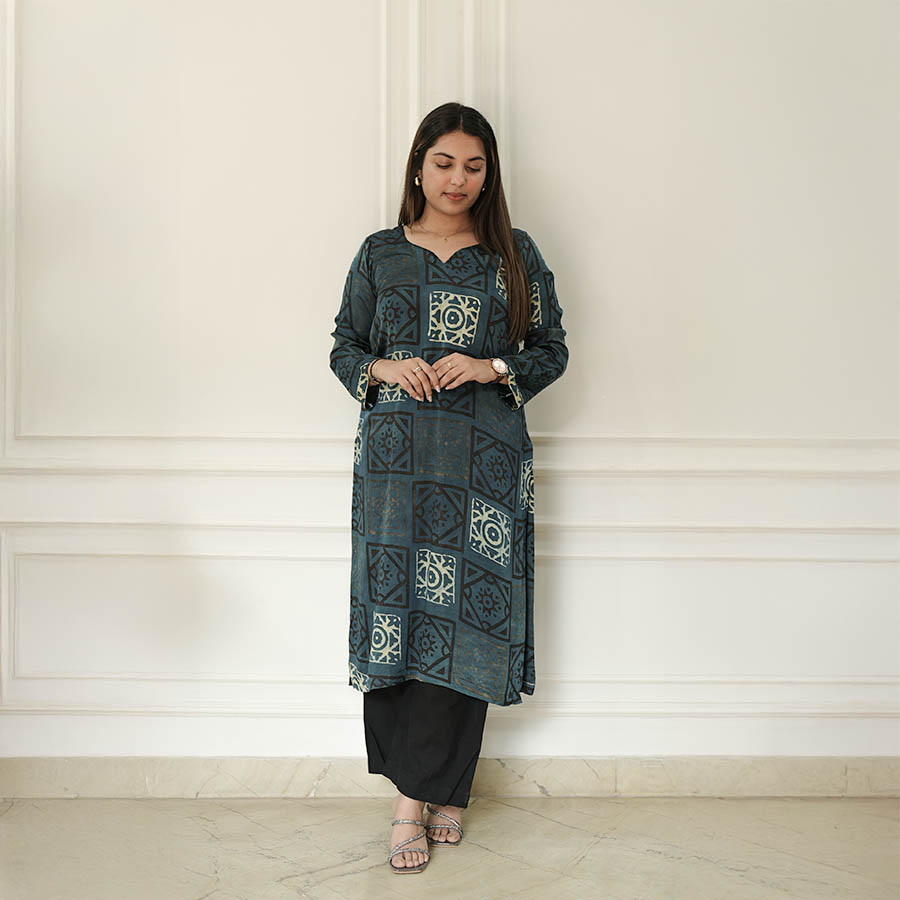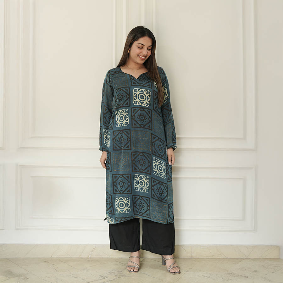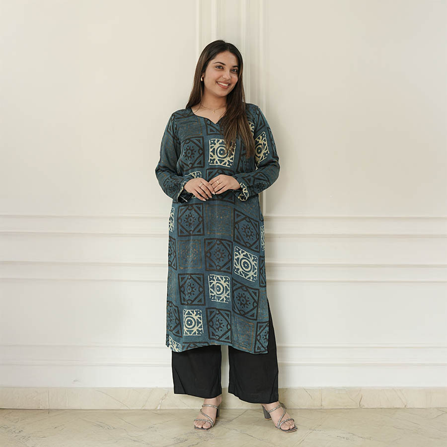 Crafted from lustrous modal satin, this long kurta features a flattering sweetheart neckline and 3/4th sleeves for an effortlessly refined look. Soft, breathable, and comfortable, it’s perfect for day-to-evening wear. Style it with trousers, skirts, or denim for a modern take on ethnic dressing.