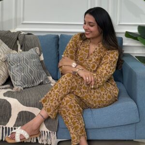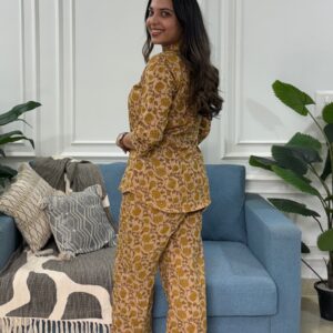 A mustard-hued floral cotton coord set, IndiBloom, that brings comfort and charm together in perfect harmony. Featuring a vibrant, all-over print, this breezy ensemble is tailored with three-fourth sleeves and full-length straight pants for an easy yet polished silhouette. Crafted in soft, breathable cotton, it’s ideal for sunny days, relaxed outings, or casual festive moments—effortlessly capturing the spirit of everyday elegance.