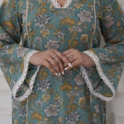 Striking and unapologetically bold, the Noor Noir Halter Kurti reimagines classic Ajrak in a sleek black palette. The halter neck and backless silhouette bring modern drama, while the bobbin elastic at the back creates a comfortable, universal fit. It’s tradition with attitude- made for nights out, festive moods, and everything in between.